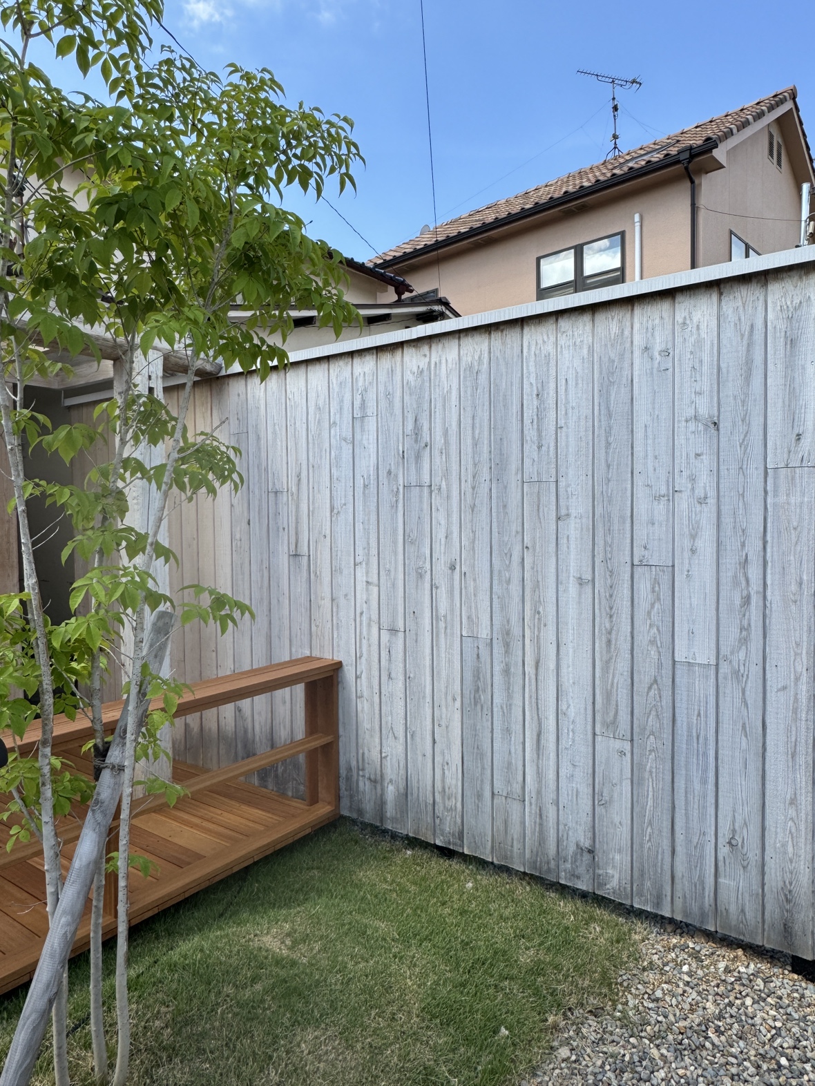 多くのデッキ材の中からコスパの高い材料を選択。北側庭の心地よさを体感する事ができます。