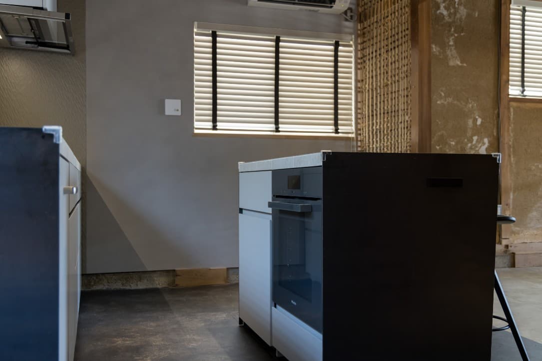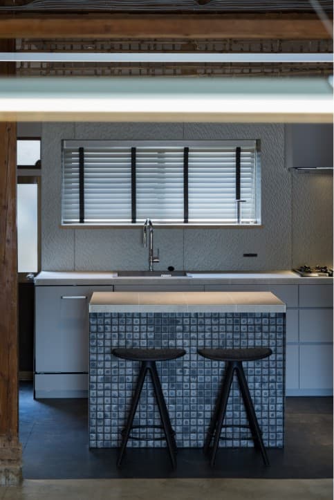 既存の台所スペースに合わせて、使いやすいアイランドキッチンをオーダー制作。ドイツのプレミアムブランド「ミーレ」の食洗機、オーブン。「ガゲナウ」のコンロとレンジフード。「ハンスグローエ」の水栓具。壁面は、地元姫路産の瓦素材。カウンタートップは大判タイルで天板を制作。
