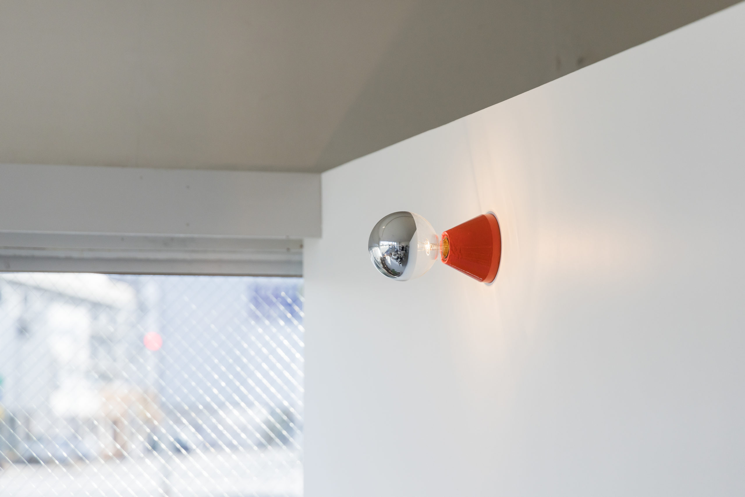 白の壁に、赤のライト。白のタイルに、赤の目地。統一感があって美しいです。