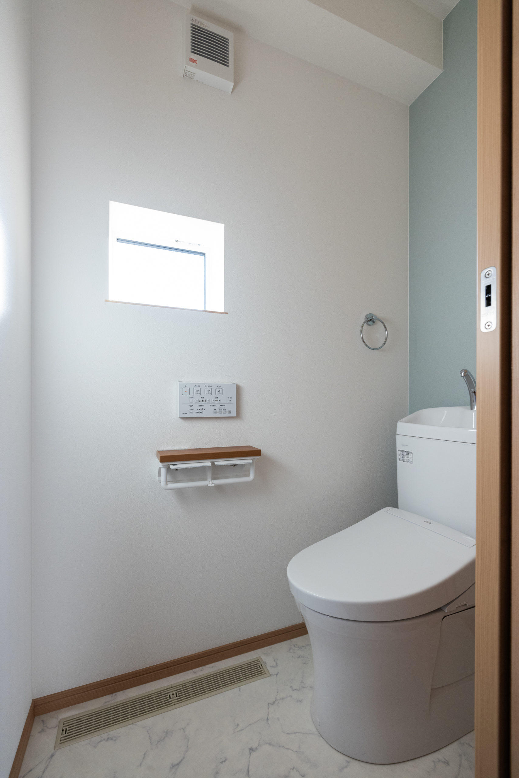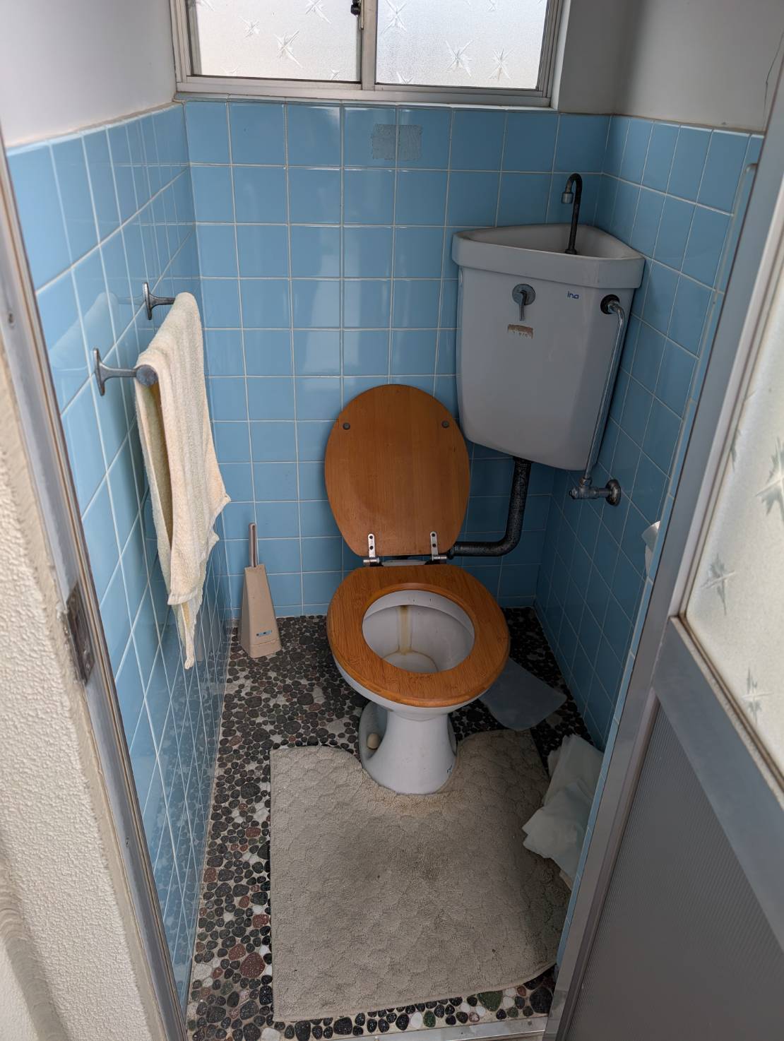 トイレの入れ替え。寒々しい印象だったタイルから清潔感のあるライトブルーの壁紙でさわやかになりました。