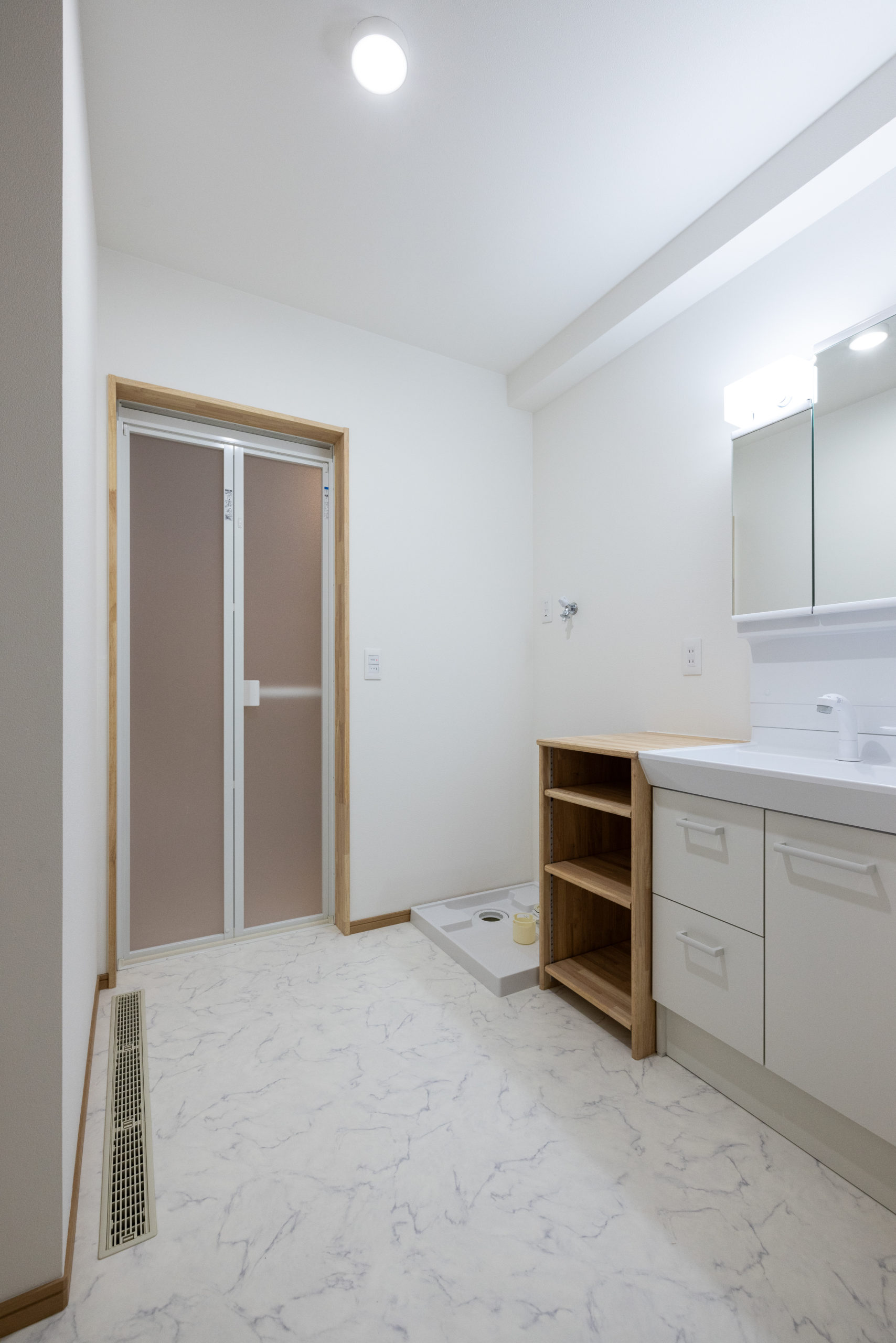 壁を無くし広々とした脱衣所。こちらにも床下エアコンの空気口が設置されていることで、冬場のヒートショック対策にもなります。